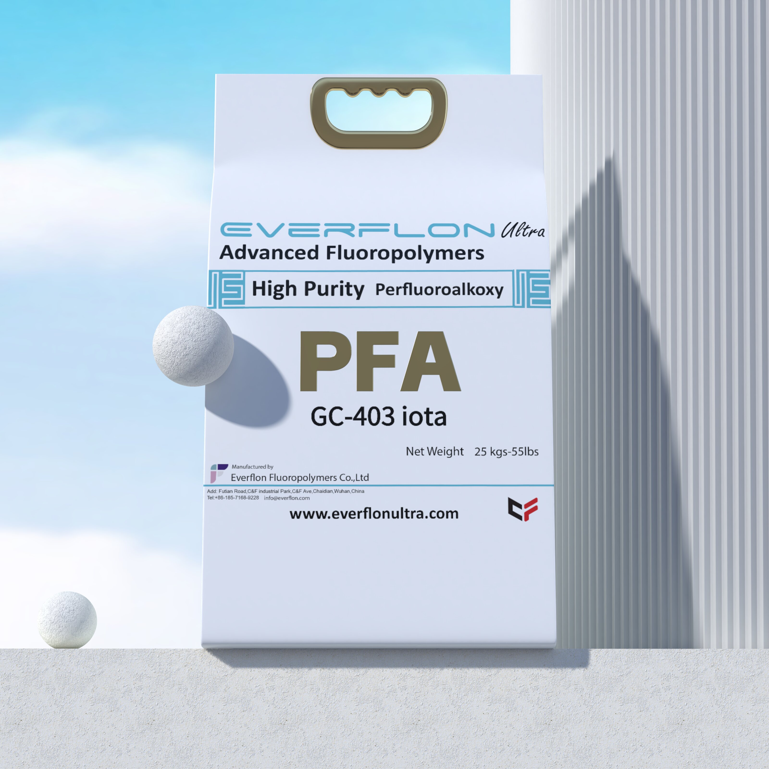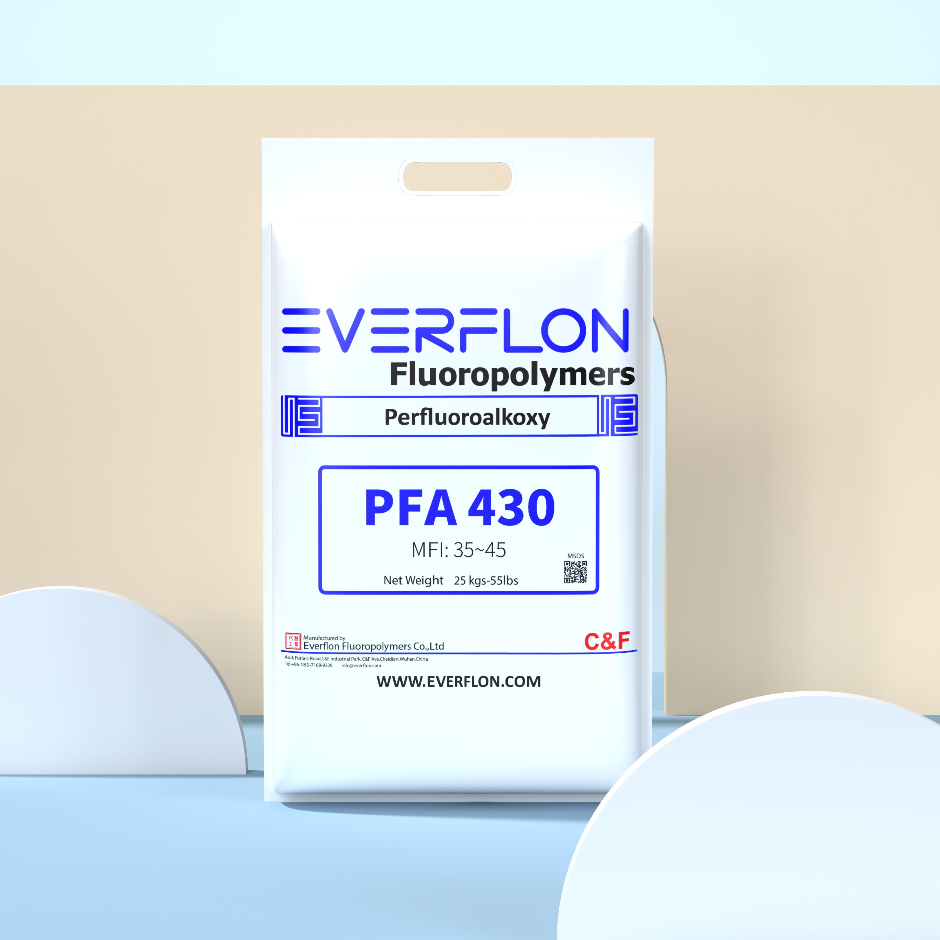 The properties of Everflon™ PFA resin are not affected by storage time. Ambient storage conditions should be designed to avoid airborne contamination and water condensation on the resin when it is removed from containers. Everflon™ PFA is supplied as pellets and is available in 25-kg multilayer bags with an integral polyethylene liner.